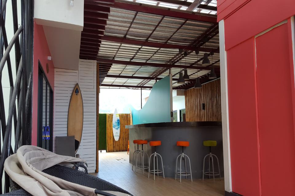 Das Hotel ist auf den ersten Blick ansprechend, bunt mit einem schönen Surferstyle. Vor der Tür befindet sich ein großer Innenhof mit Tischen und Stühlen, sowie einer art Bar mit Zapfanlage, die Abends zum BBQ betrieben wird.